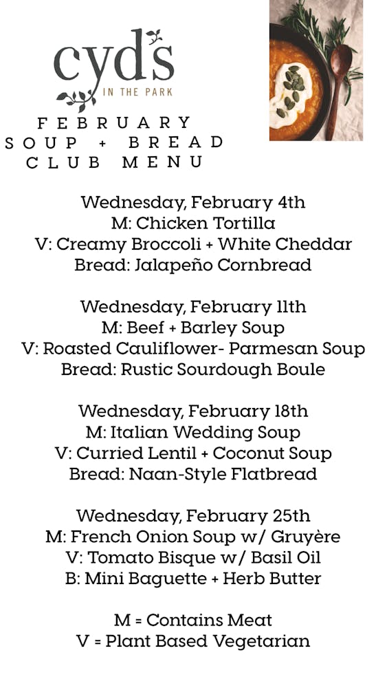 $45 per week (includes 2 quarts of soup — one meat, one vegetarian — plus fresh handmade bread)