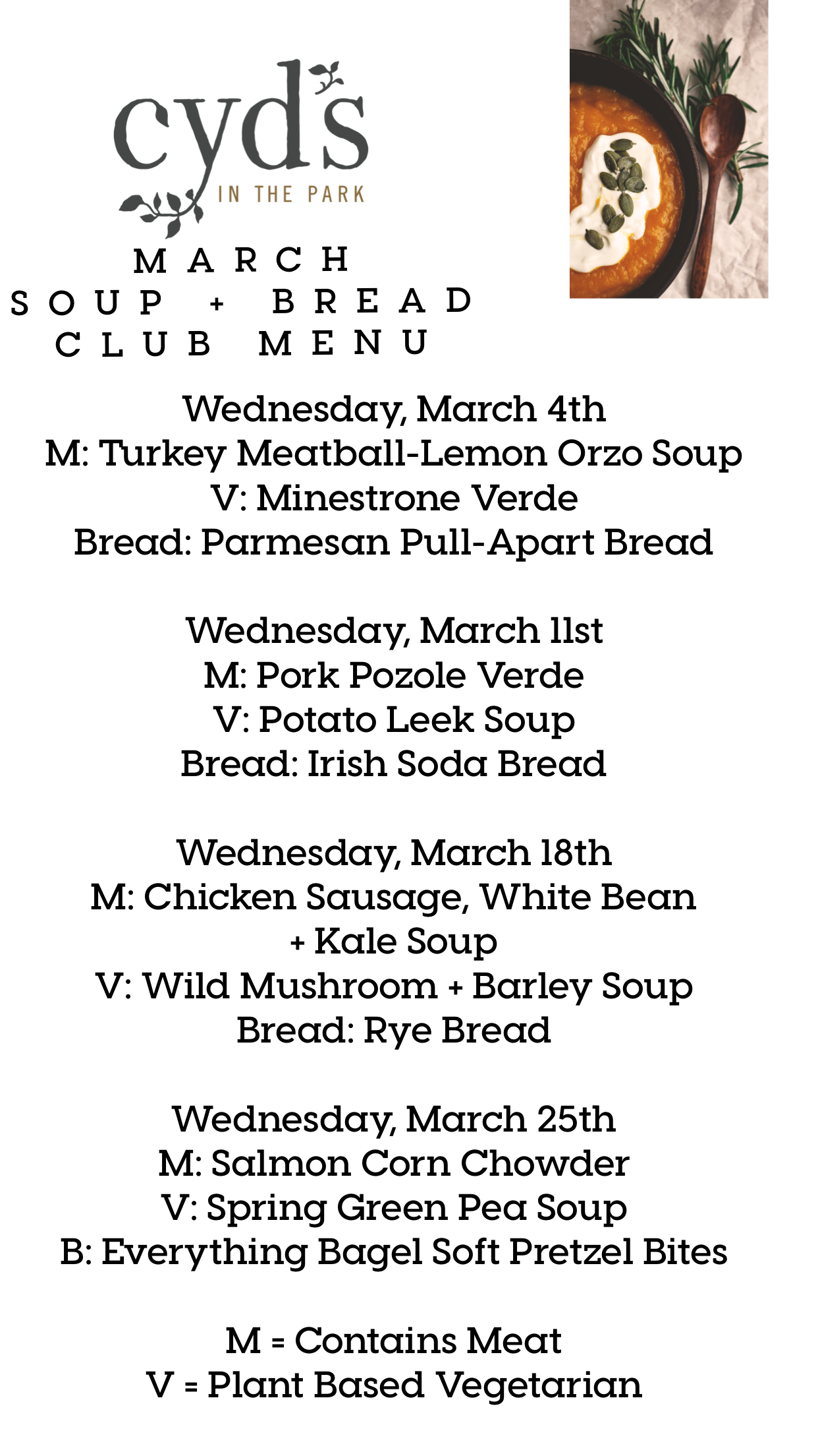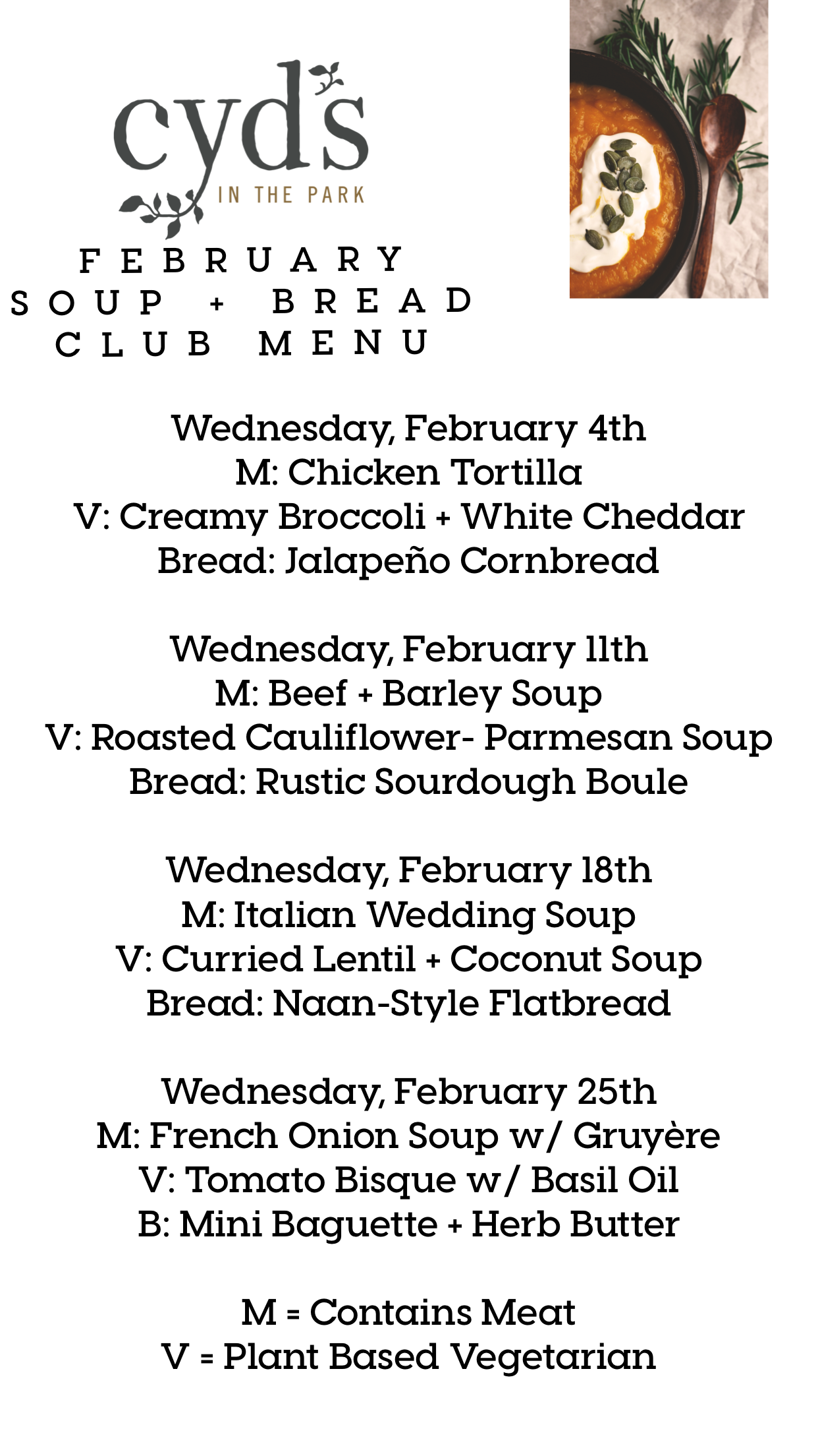 $45 per week (includes 2 quarts of soup — one meat, one vegetarian — plus fresh handmade bread)